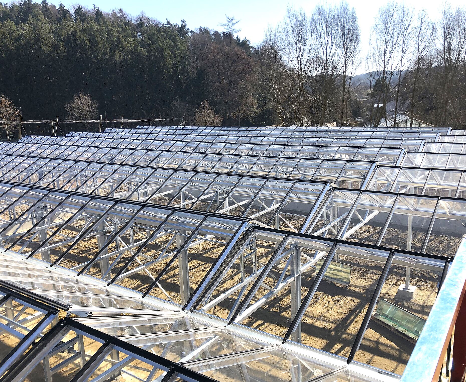 - Cabrio-Gewächshaus, 3-schiffig mit 3 x 3 Kappen (je 3,2 m breit) mit verglasten Giebeln und Folien-Rollwänden