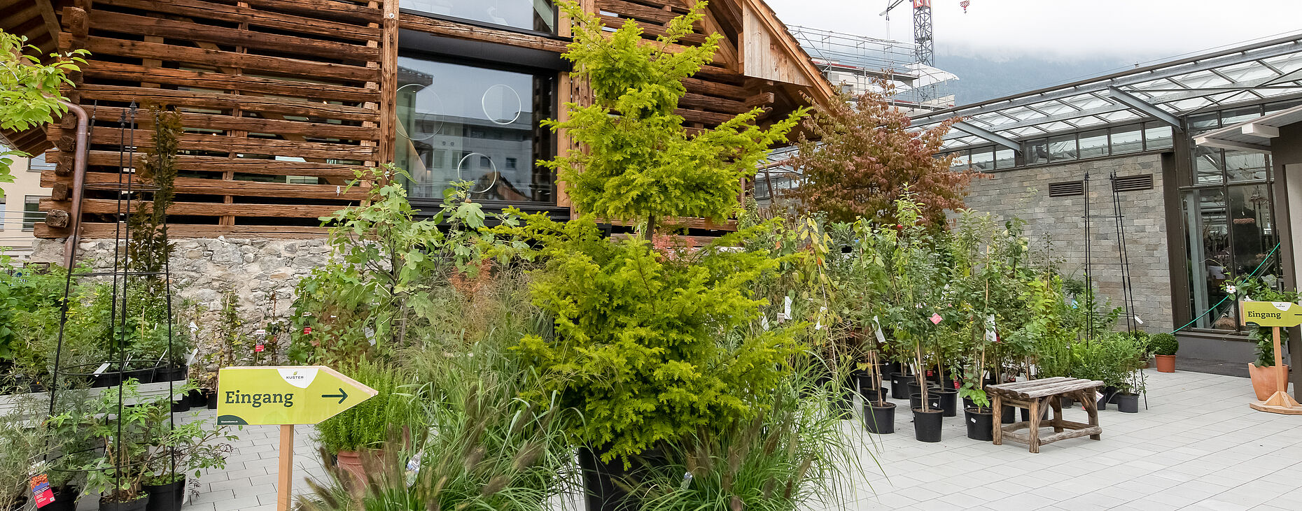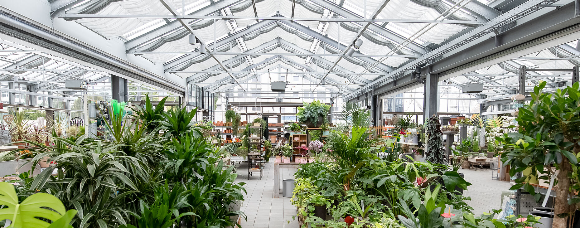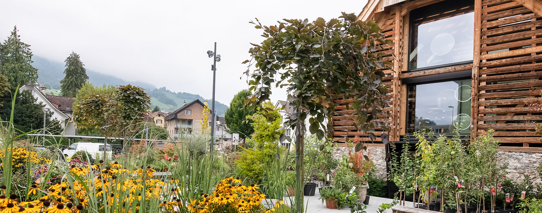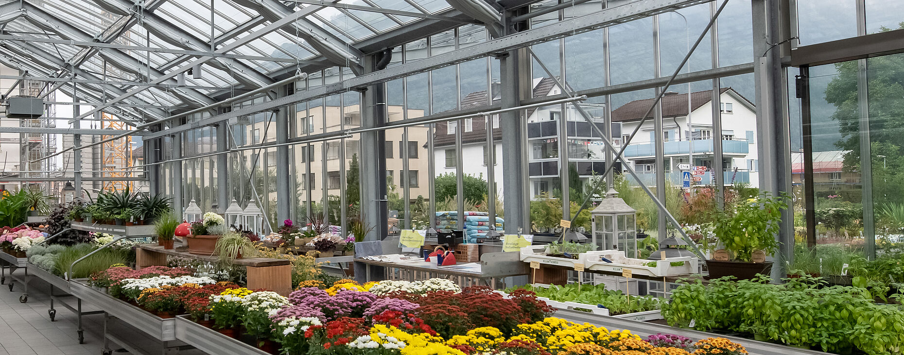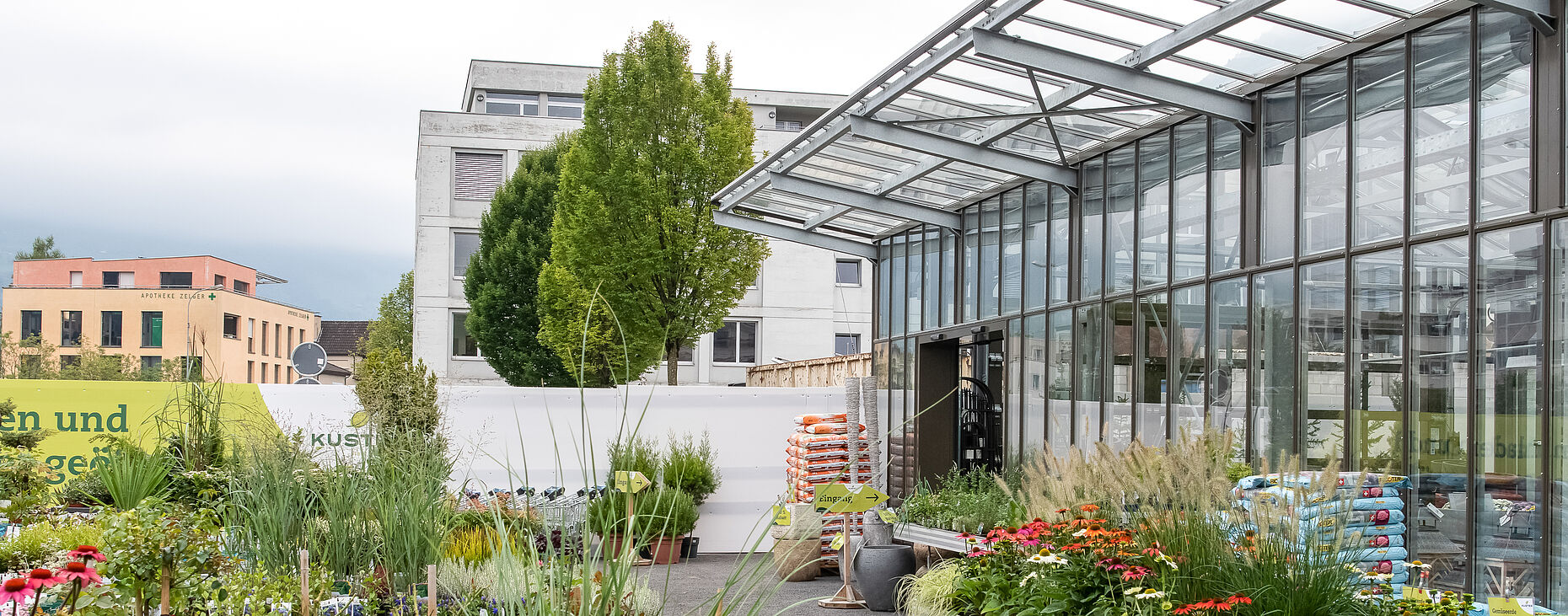 Die vier modernen Gewächshäuser des Gartencenters Kuster in Stans schaffen ein attraktives, helles Einkaufserlebnis. Neben einem hochmodernen Bürokomplex in der Optik der alten Scheune befindet sich der Eingang zum neuen Gartencenter.