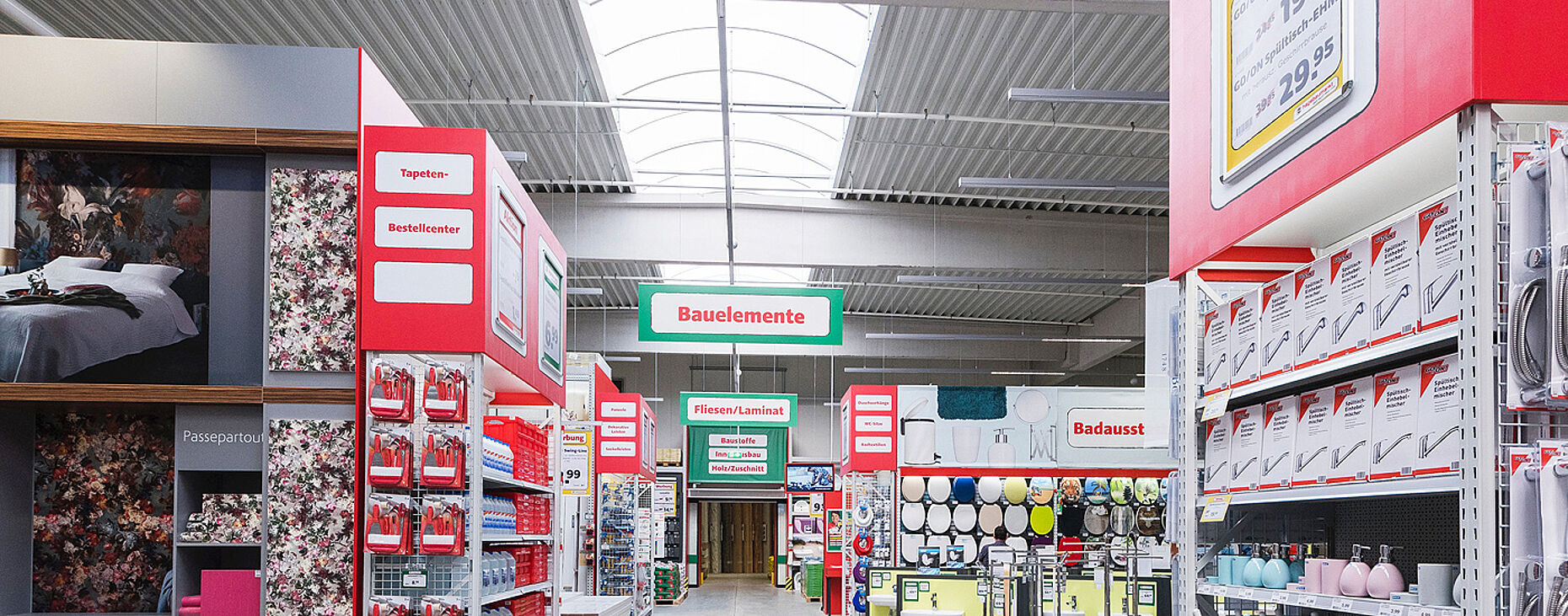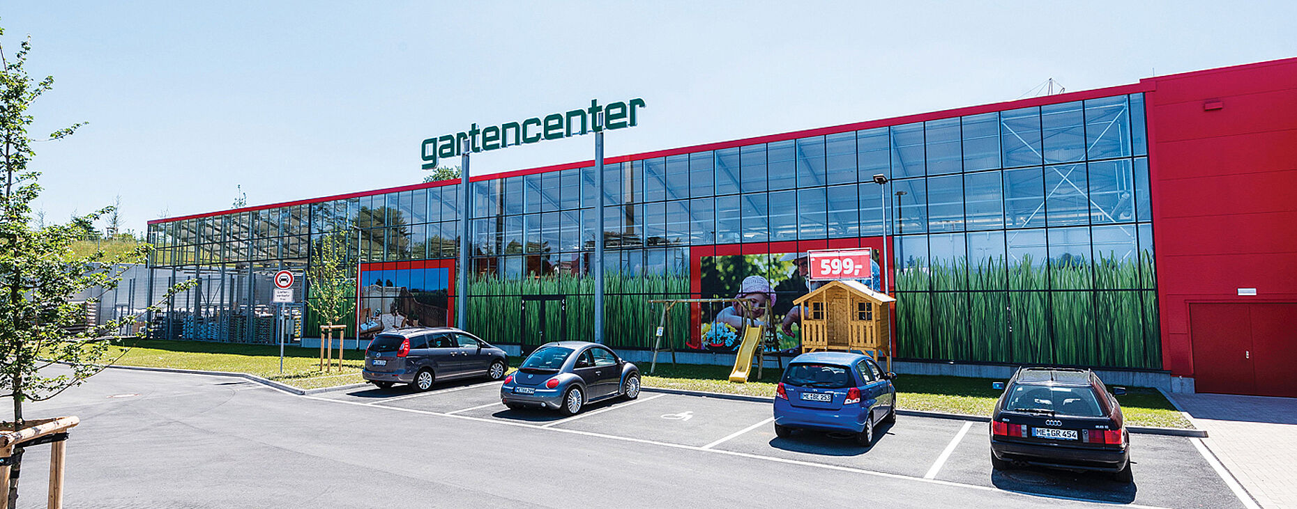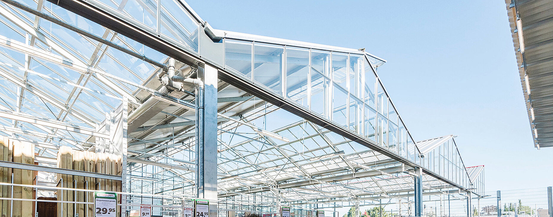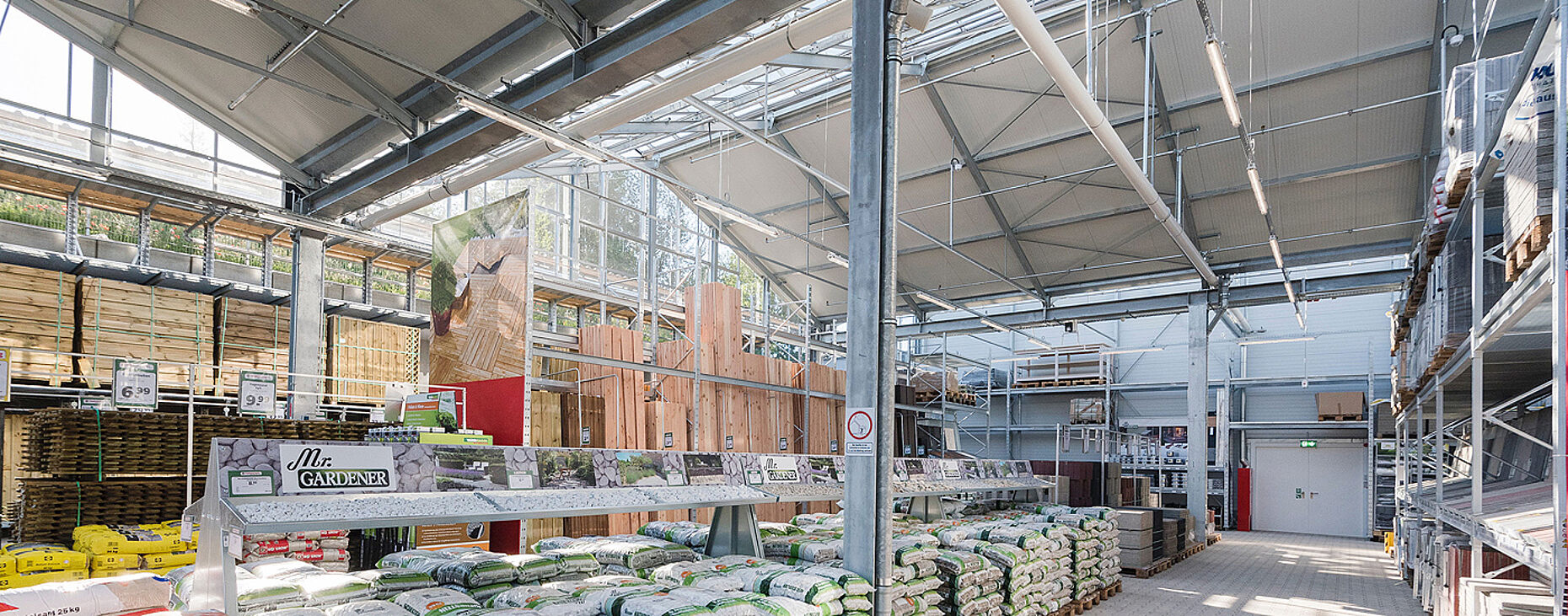 - 3-schiffiges Gartencenter mit offener Überdachung für den Verkauf von Saisonware und wetterunabhängigen Produkten