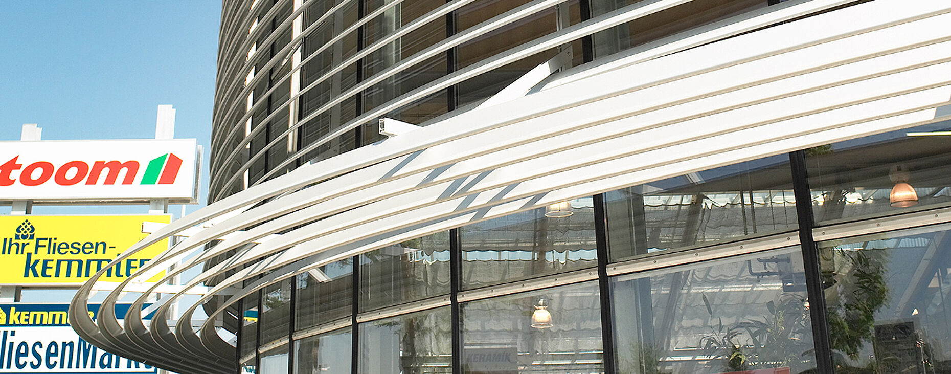 - Wärmeschutz an der Polygonalfassade durch rund gebogene Sonnenschutzlamellen